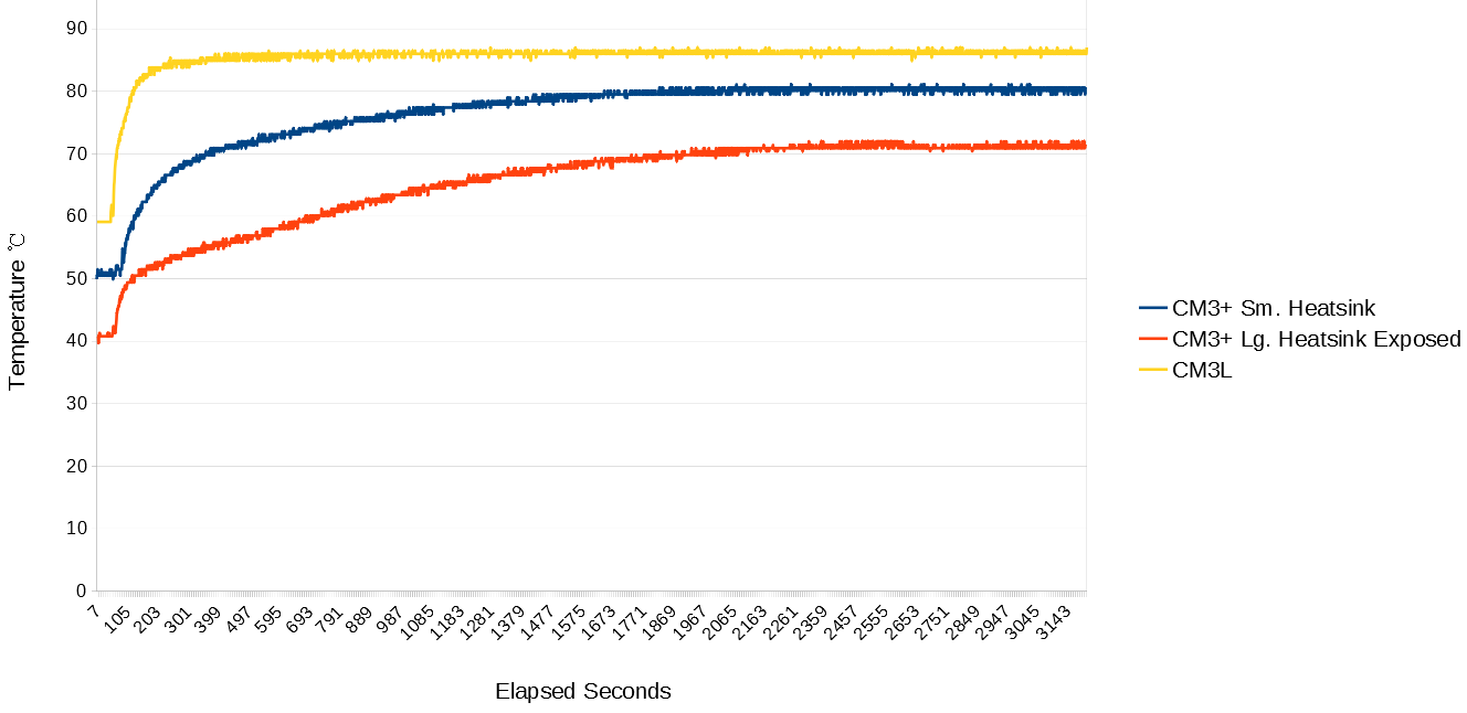The larger, externally exposed heat sink, combined with the improved thermal characteristics of the Compute Module 3+, reduces (or altogether avoids) frequency throttling of the SoC. The following image shows a thermal performance comparison at room temperature with the Compute Module at 100% utilization.
